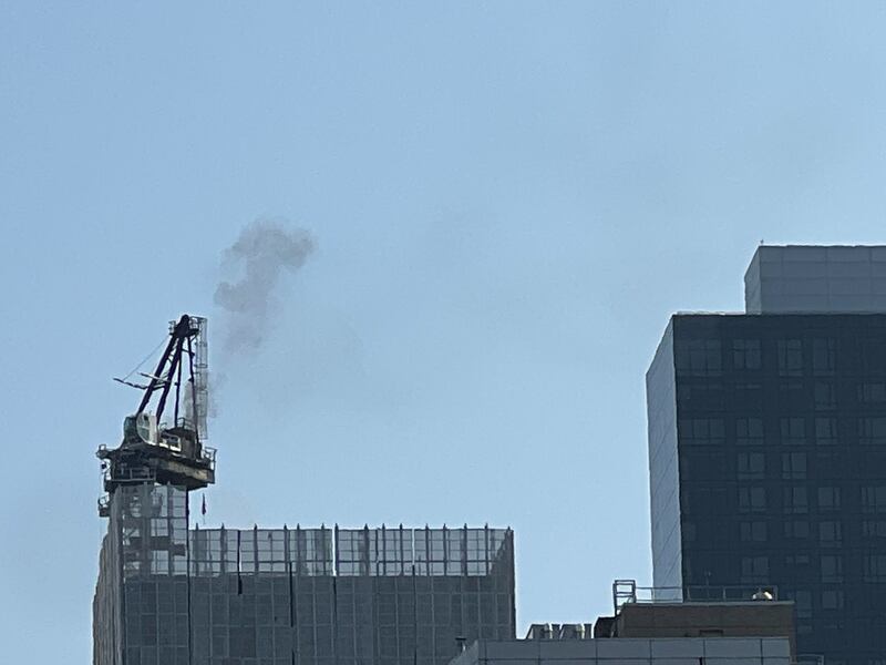 Crane Fire Smoke rises from a construction crane that caught fire in Manhattan, Wednesday, July 26, 2023, in New York. The crane lost its long arm, which smashed against a nearby building, dangled and then plummeted to the street as people ran for their lives on the sidewalk below. Some people suffered minor injuries, but no one died, according to Mayor Eric Adams .(AP Photo/Seth Wenig) (Seth Wenig)