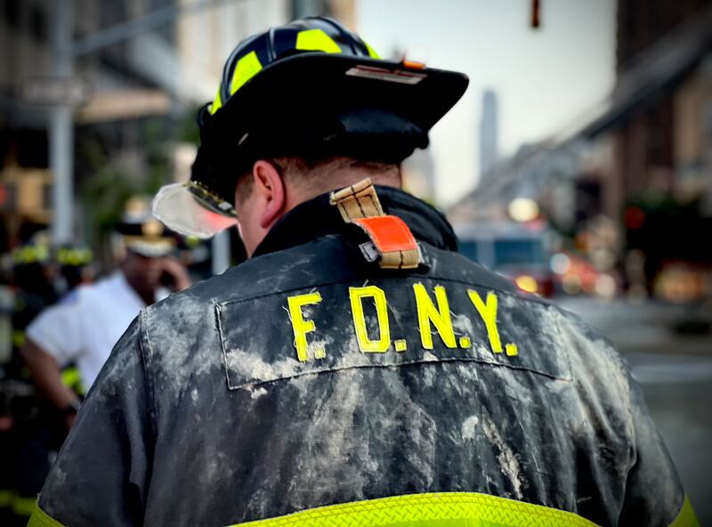 Crane collapse Firefighters carry hoses as they deal with a construction crane fire and collapse in New York, on July 26, 2023. The New York City Fire Department reported two firefighters and at least four civilians suffered minor injuries in the accident. (Photo by Kena Betancur / AFP) (Photo by KENA BETANCUR/AFP via Getty Images) (KENA BETANCUR/AFP via Getty Images)
