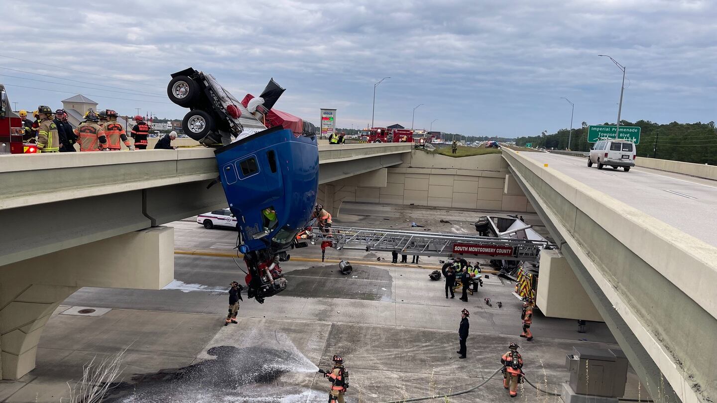 Crash leaves 18-wheeler dangling off overpass A crash on a Texas highway left a dramatic scene behind when a semi-truck was left dangling from an overpass. ( Spring Fire Department)