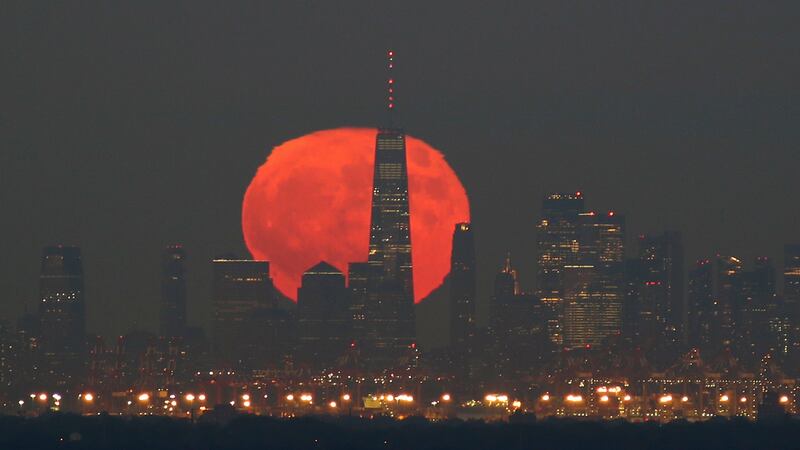 Photos: Halloween Blue Moon brightens the night sky The full Blue Moon and Hunter's Moon rises behind lower Manhattan and One World Trade Center in New York City on Halloween on October 31, 2020, as seen from Greenbrook Township, New Jersey. (Gary Hershorn/Getty Images)