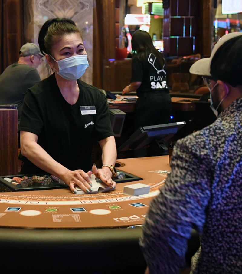 Casinos LAS VEGAS, NEVADA - JUNE 04: Dealer Leah Prerost wears a mask as she deals cards to Evan Savar of Nevada at a blackjack table with spaced out seats for social distancing at the Red Rock Resort after the property opened for the first time since being closed on March 17 because of the coronavirus (COVID-19) pandemic, on June 4, 2020 in Las Vegas, Nevada. Hotel-casinos throughout the state are opening today as part of a phased reopening of the economy with social distancing guidelines and other restrictions in place. (Photo by Ethan Miller/Getty Images) (Ethan Miller/Getty Images)