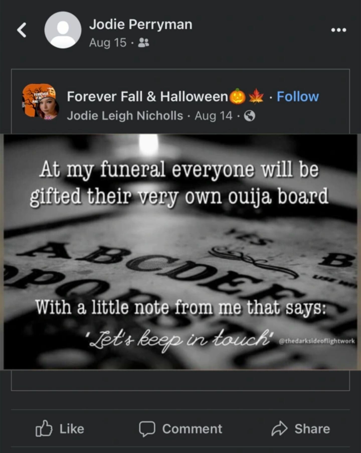 According to “Today,” each person who showed up to pay their respects received a keepsake Ouija board, complete with an accompanying photo of Perryman sticking her tongue out and a note that read, “Let’s keep in touch!”