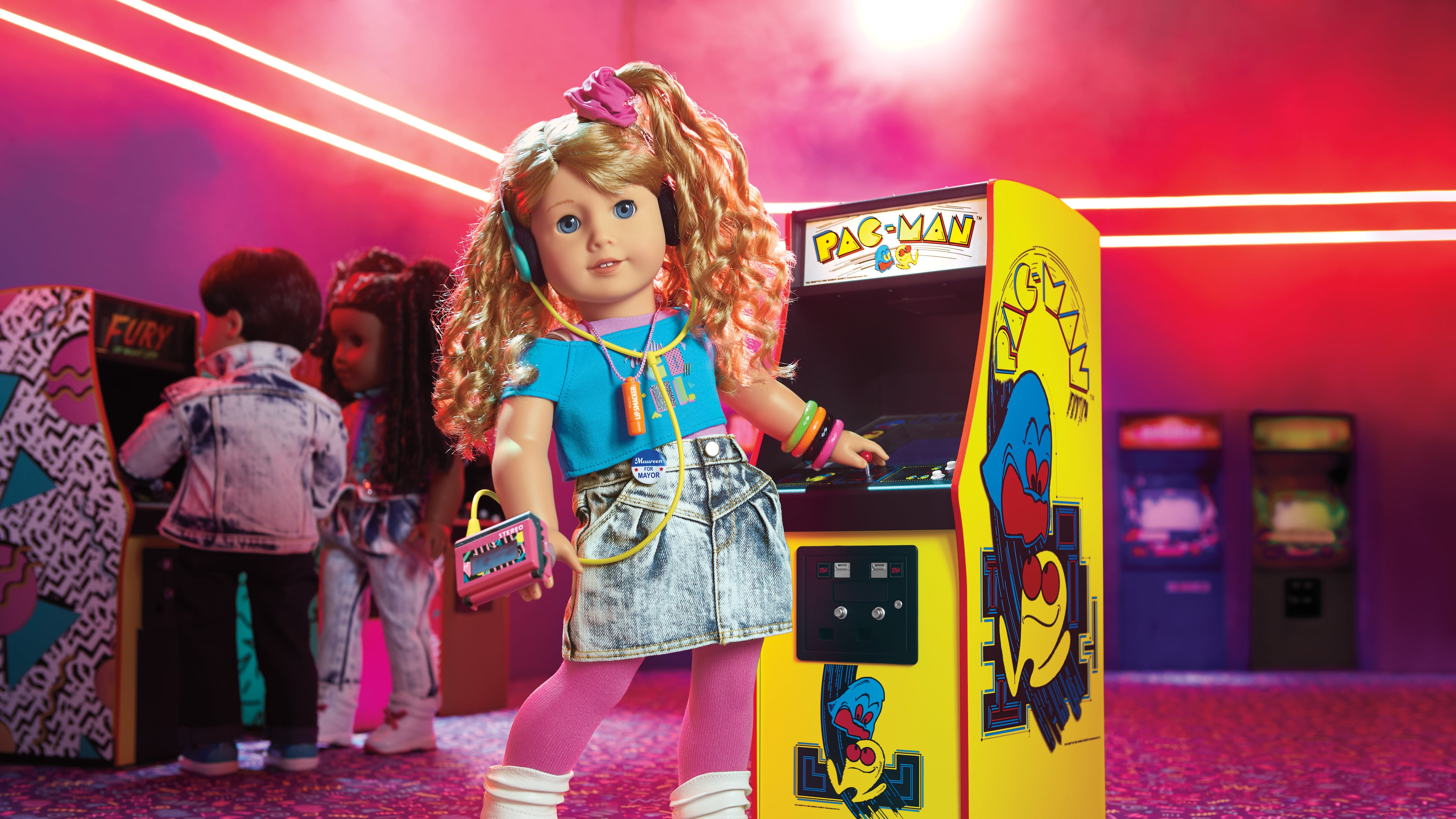 Some of her accessories include ’80s staples like Care Bears, suspenders, jean jackets, a Caboodle and a doll-sized playable Pac-Man arcade game.
