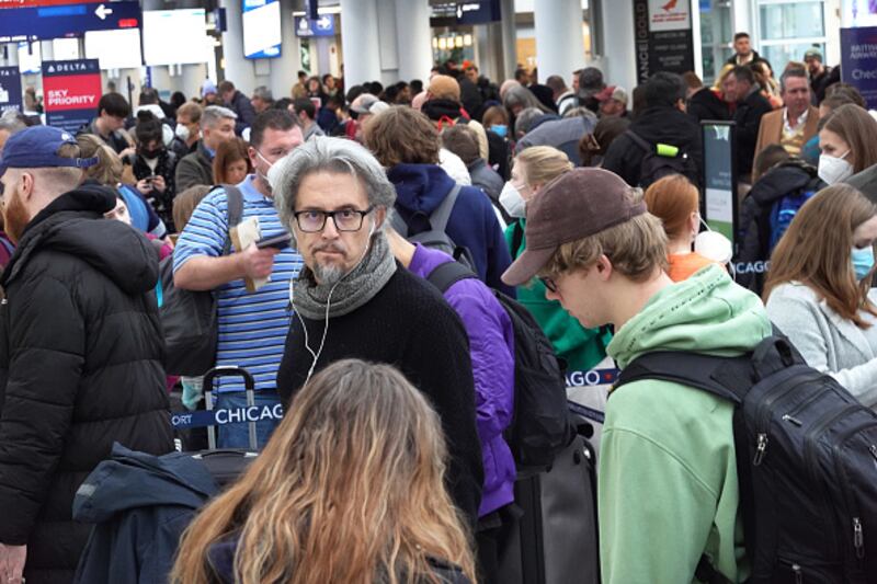 Winter weather CHICAGO, ILLINOIS - DECEMBER 22: Travelers arrive for flights at O'Hare International Airport on December 22, 2022 in Chicago, Illinois. A winter weather system bringing snow, high winds, and sub-zero temperatures has wreaked havoc on holiday travel during one of the busiest days of the year for airlines. As of 8:00 AM more than 400 flights out O'Hare had been cancelled. (Photo by Scott Olson/Getty Images) (Scott Olson/Getty Images)