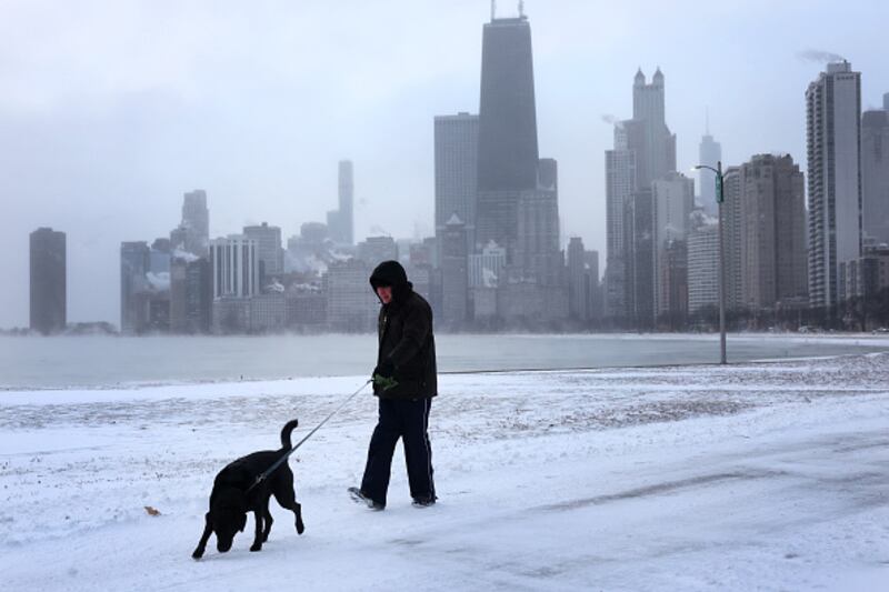 Winter weather CHICAGO, ILLINOIS - DECEMBER 23: A man walks his dog along the lakefront near downtown as temperatures hover about -6 degrees on December 22, 2022 in Chicago, Illinois. Sub-zero temperatures are expected to grip the city for the next couple of days with wind chill temperature dipping as low as -40 degrees. (Photo by Scott Olson/Getty Images) (Scott Olson/Getty Images)