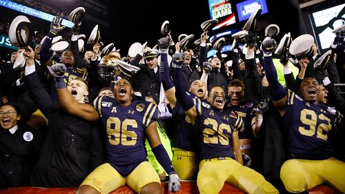 Army v Navy PHILADELPHIA, PENNSYLVANIA - DECEMBER 14: The Navy Midshipmen celebrate the win over the Army Black Knights at Lincoln Financial Field on December 14, 2019 in Philadelphia, Pennsylvania.The Navy Midshipmen defeated the Army Black Knights 31-7. (Photo by Elsa/Getty Images) (Elsa/Getty Images)