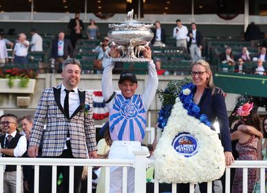 155th Belmont Stakes: Javier Castellano holds the winner's trophy with Arcangelo owner Jon Ebbert, left, and trainer Jena Antonucci after winning the 155th Belmont Stakes. (Al Bello/Getty Images)