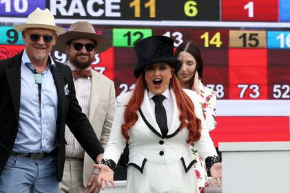 150th Kentucky Derby: Wynonna Judd and husband Cactus Moser react after the national anthem before the start of the 150th running of the Kentucky Derby at Churchill Downs. (Rob Carr/Getty Images)