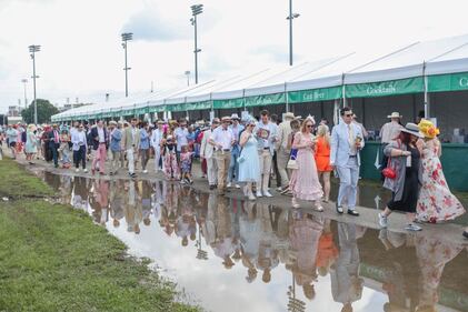 150th Kentucky Derby: The grounds were wet at Churchill Downs as people line up to attend the 150th running of the Kentucky Derby. (LEANDRO LOZADA/AFP via Getty Images)