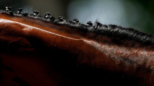 Photos: Fans return for 2021 Belmont Stakes A braided mane adorns a thoroughbred horse's neck before the 153rd running of the Belmont Stakes horse race, Saturday, June 5, 2021, in Elmont, N.Y. (AP Photo/Eduardo Munoz Alvarez) (Eduardo Munoz Alvarez/AP)
