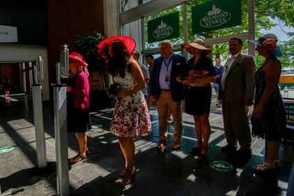Photos: Fans return for 2021 Belmont Stakes Horse racing fans are screened for their body temperature as they arrive at Belmont Park for the 153rd running of the Belmont Stakes horse race, Saturday, June 5, 2021, in Elmont, N.Y. (AP Photo/Eduardo Munoz Alvarez) (Eduardo Munoz Alvarez/AP)
