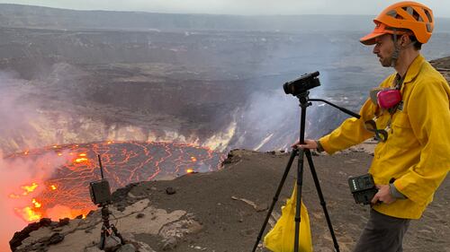 Photos: Hawaii's Kilauea volcano erupts A USGS Hawaiian Volcano Observatory geologist takes video of the eruption that started within Halemaumau crater, Kilauea summit, at about 3:20 p.m. on September 29, 2021. (D. Downs/USGS)
