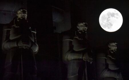 Super flower moon 2020 The moon shines through between two figures on the roof of the Bavarian Parliament in Munich, Germany, on May 6, 2020. (Peter Kneffel/picture alliance via Getty Images)