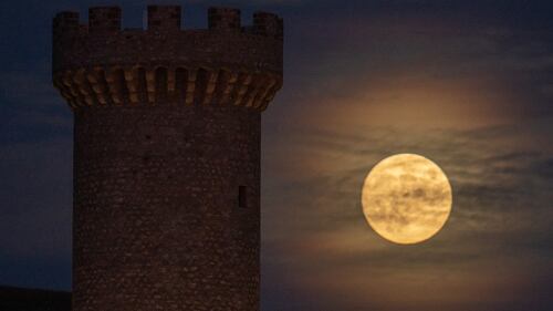 Photos: October 2021 Hunter's Moon brightens the night sky The Hunter's Moon rises at a size of 99.6 percent behind Torre Medicea medieval tower in Santo Stefano di Sessanio, Italy, on October 19, 2021. (Lorenzo Di Cola/NurPhoto via Getty Images)