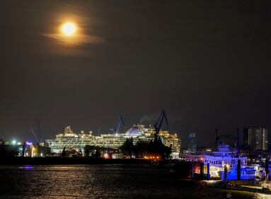 Photos: October 2021 Hunter's Moon brightens the night sky A cruise ship lies in a dock in the harbor of Hamburg, Germany, as the moon shines on Wednesday, Oct. 20, 2021. (AP Photo/Michael Probst)