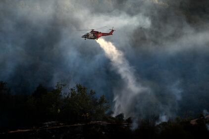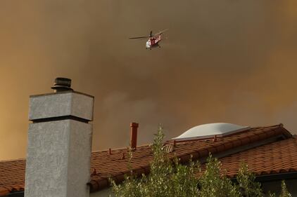 Photos: 'Palisades Fire' in California threatens homes, prompts evacuations A firefighting helicopter flies away after dropping water over a brush fire scorching at least 100 acres in the Pacific Palisades area of Los Angeles Saturday, May 15, 2021. (AP Photo/Ringo H.W. Chiu)