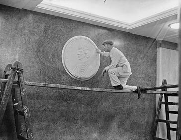 Queen Mary A workman putting the finishing touches to a plaque of the British Queen consort, Mary of Teck on the first class deck of the ocean liner RMS Queen Mary, during construction at the shipyard of John Brown & Company in Clydebank, Scotland, 3rd March 1936. The ship is almost ready for her maiden voyage on 27th May 1936. (Photo by Davies/Topical Press Agency/Hulton Archive/Getty Images) (Davies/Getty Images)
