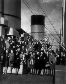 Queen Mary circa 1946: GI brides aboard the Queen Mary on their way to the USA, wave goodbye to Britain. (Photo by Keystone/Getty Images) (Keystone/Getty Images)