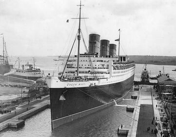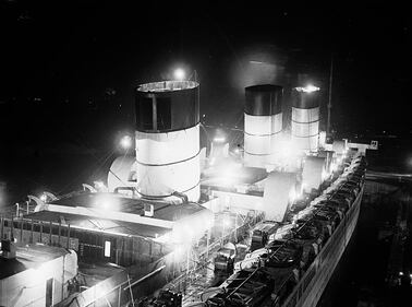 Queen Mary 30th December 1936: The liner 'Queen Mary' in dock at Southampton where workmen are working through the night to make alterations to the ship. (Photo by E. Phillips/Fox Photos/Getty Images) (E. Phillips/Getty Images)