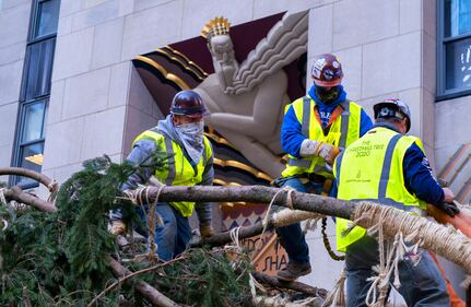 Rockefeller Center Christmas tree arrives in New York A worker walks across the trunk of the 2020 Rockefeller Center Christmas tree, a 75-foot tall Norway Spruce that was acquired in Oneonta, N.Y., as it is prepared for setting on a platform at Rockefeller Center Saturday, Nov. 14, 2020, in New York. (AP Photo/Craig Ruttle) (Craig Ruttle/AP)