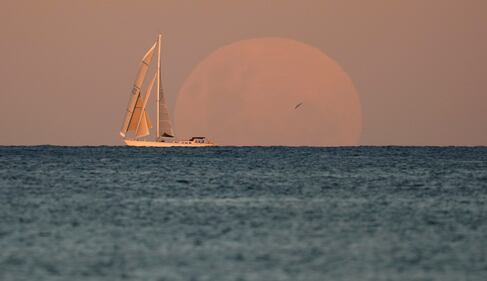 Photos: Super Flower Blood Moon 2021 delights skygazers, coincides with lunar eclipse A yacht sails past as the moon rises in Sydney Wednesday, May 26, 2021. A total lunar eclipse, also known as a Super Blood Moon, will take place later tonight as the moon appears slightly reddish-orange in colour. (AP Photo/Mark Baker)