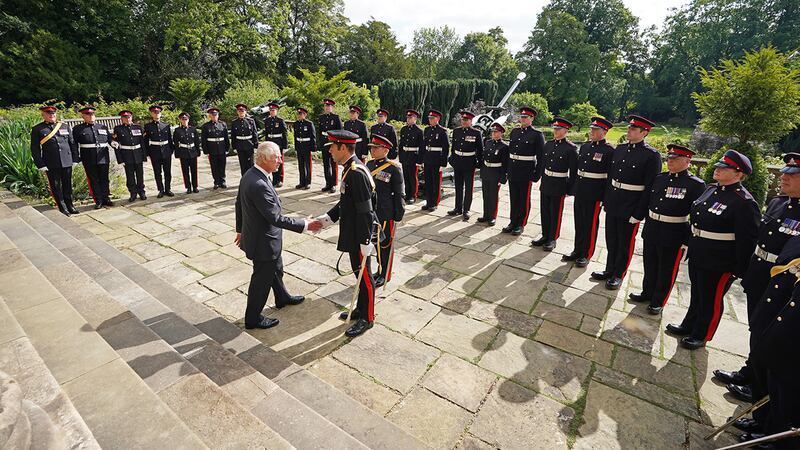 Photos: King Charles III visits Northern Ireland King Charles III meets troops during a reception at Hillsborough Castle on September 13, 2022 in Hillsborough, United Kingdom. King Charles III is visiting Northern Ireland for the first time since ascending to the throne following the death of his mother, Queen Elizabeth II, who died at Balmoral Castle on September 8, 2022. (Photo by Niall Carson - WPA Pool/Getty Images) (WPA Pool/Getty Images)