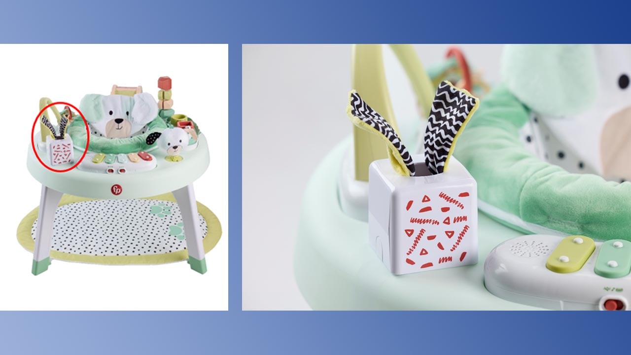 The Consumer Product Safety Commission said the Fisher-Price 3-in-1 SnugaPuppy Activity Center’s detachable toy tissue box can come apart and allow access to the small support brackets.