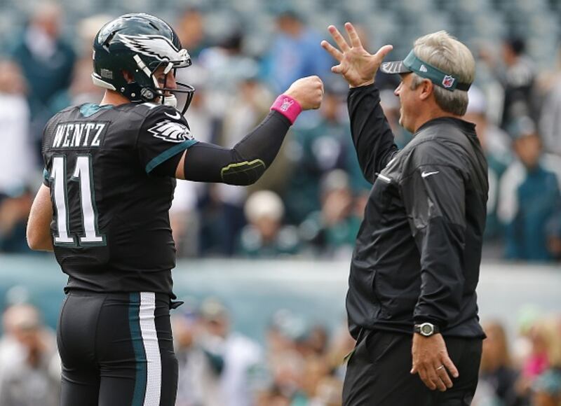 Photos: NFL coach Doug Pederson through the years 2016: Carson Wentz and head coach Doug Pederson fist-bump during warmups before taking on the Minnesota Vikings at Lincoln Financial Field on October 23, 2016, in Philadelphia. (Rich Schultz/Getty Images)