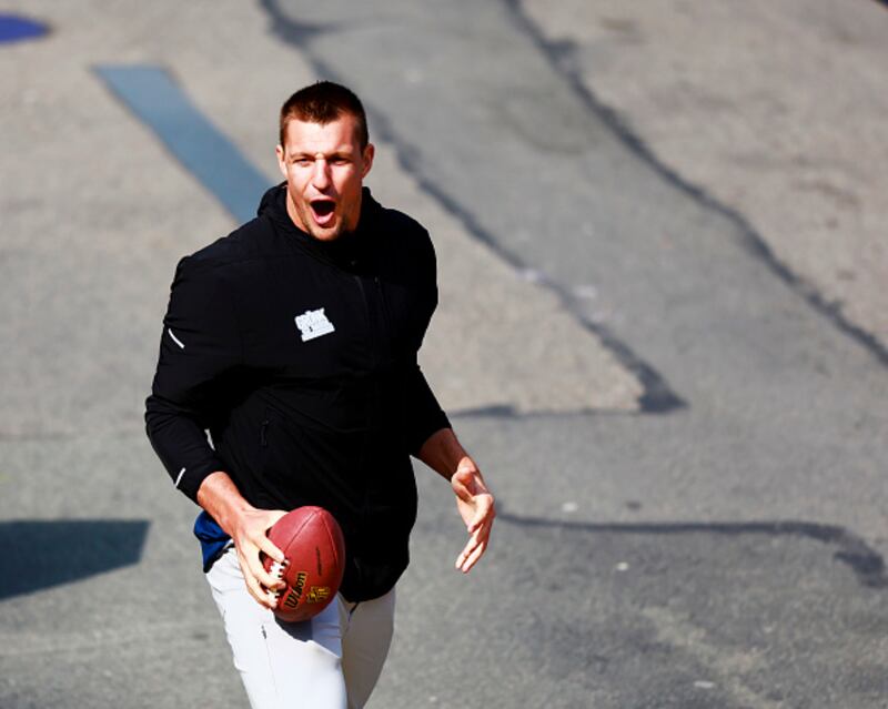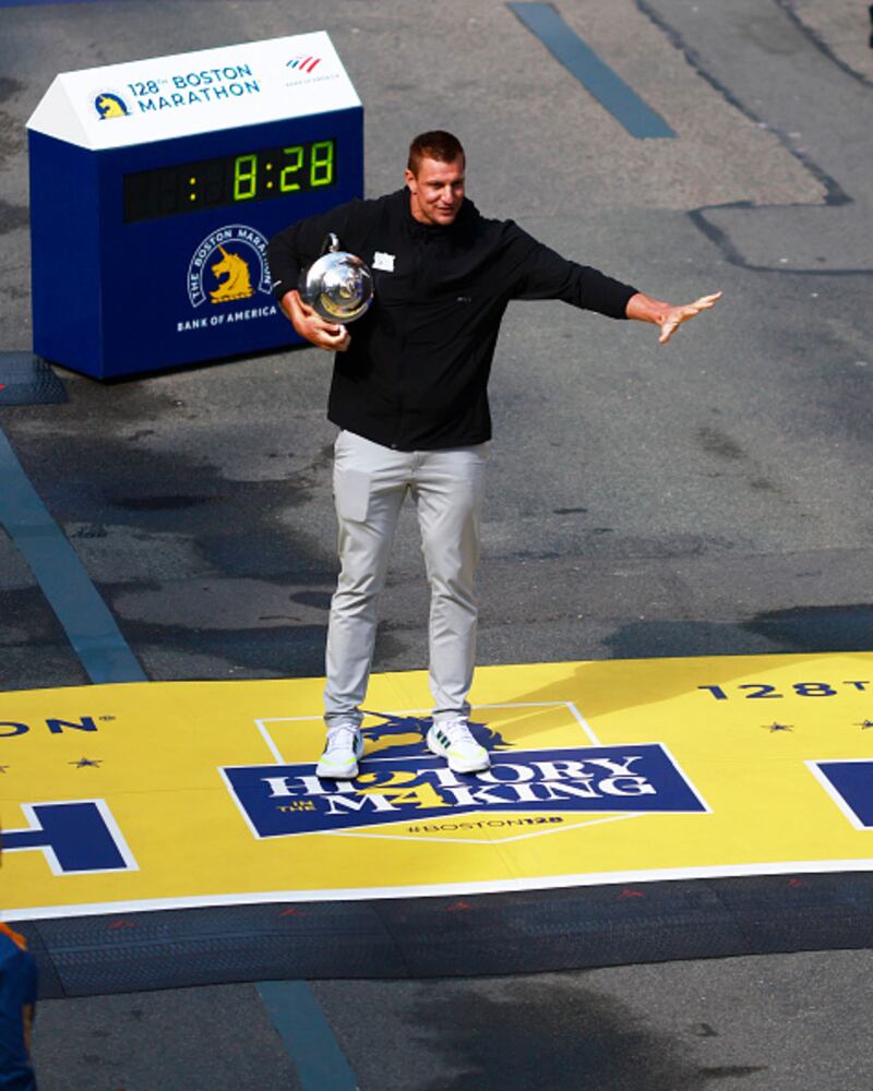128th Boston Marathon BOSTON, MASSACHUSETTS - APRIL 15: Boston Marathon Grand Marshal and former New England Patriot Rob Gronkowski shows off the winner's trophy at the finish line during the 128th Boston Marathon on April 15, 2024 in Boston, Massachusetts. (Photo by Omar Rawlings/Getty Images) (Omar Rawlings/Getty Images)
