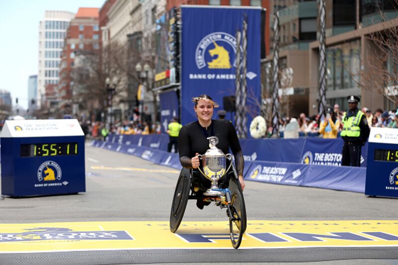 128th Boston Marathon BOSTON, MASSACHUSETTS - APRIL 15: Eden Rainbow Cooper of Great Britain crosses the finish line to win the Professional Women's Wheelchair Division at the 128th Boston Marathon on April 15, 2024 in Boston, Massachusetts. (Photo by Paul Rutherford/Getty Images) (Paul Rutherford/Getty Images)
