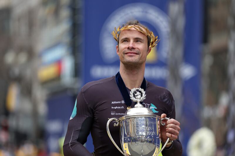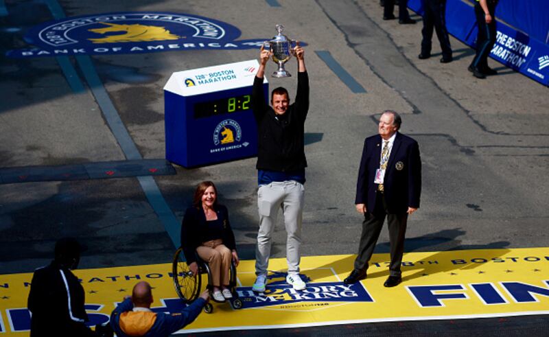 128th Boston Marathon BOSTON, MASSACHUSETTS - APRIL 15: Marcel Hug of Switzerland poses with the trophy on the finish line after winning the professional Men's Wheelchair Division during the 128th Boston Marathon on April 15, 2024 in Boston, Massachusetts. (Photo by Paul Rutherford/Getty Images) (Paul Rutherford/Getty Images)