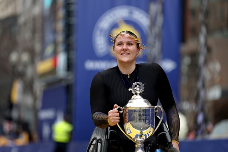 128th Boston Marathon BOSTON, MASSACHUSETTS - APRIL 15: Eden Rainbow Cooper of Great Britain poses with the trophy on the finish line after winning the professional Women's Wheelchair Division during the 128th Boston Marathon on April 15, 2024 in Boston, Massachusetts. (Photo by Paul Rutherford/Getty Images) (Paul Rutherford/Getty Images)