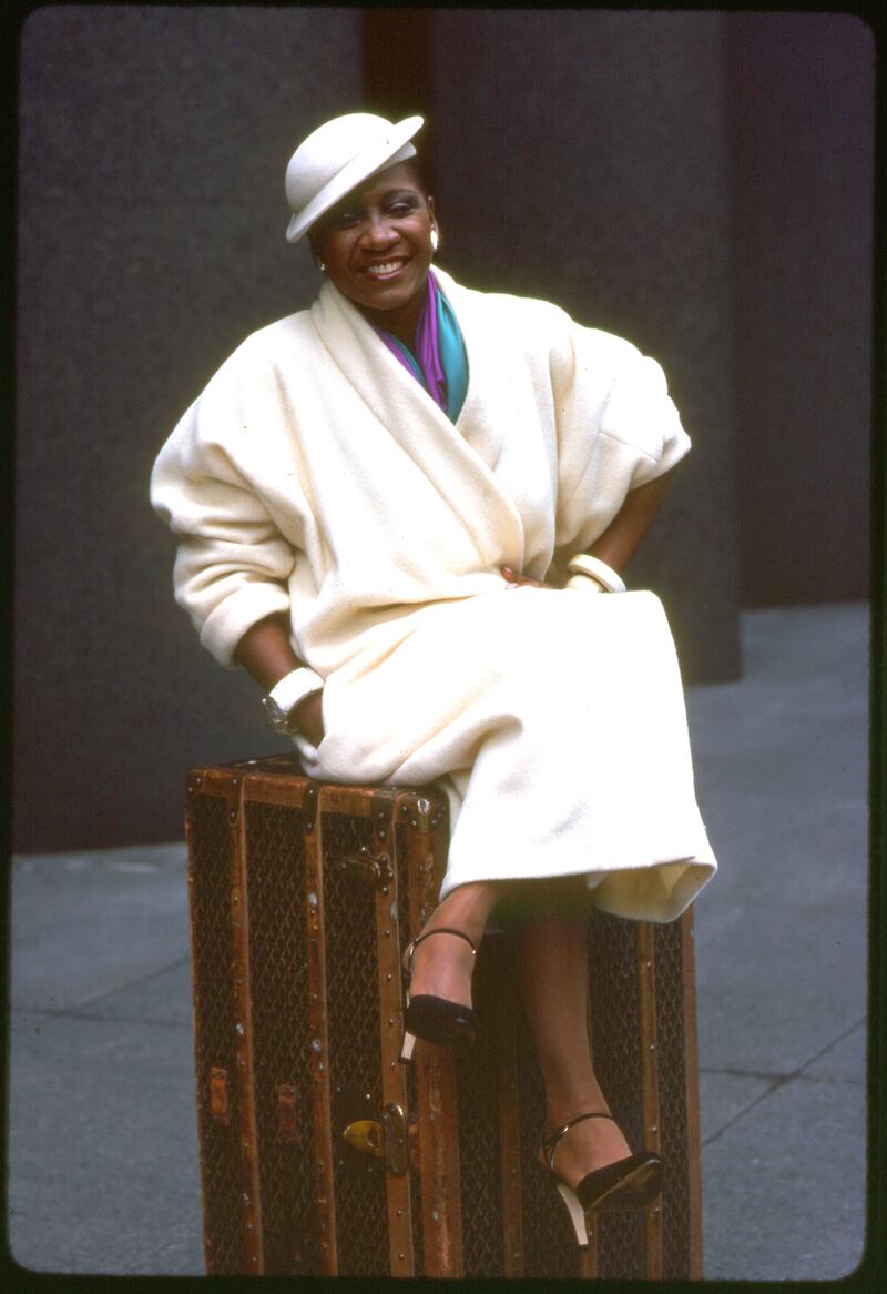 1980 Portrait of American singer and actress Patti LaBelle (born Patricia Louise Holte), dressed in a white coat, as she sits perched upon a steamer truck, 1980s. (Photo by Anthony Barboza/Getty Images) (Anthony Barboza/Getty Images)