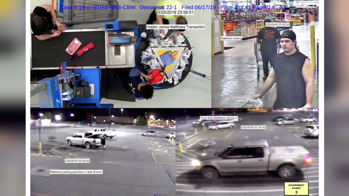Surveillance images included among the court documents show Matthews making the purchases and putting them into a truck that prosecutors said belonged to his parents before driving away. According to The New York Times, the pickup truck was also spotted in security footage shot near the scene of each fire.