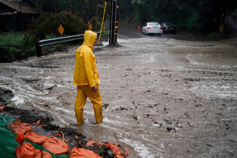 California storms A resident stands in the flooded road during a rain storm in Silverado Canyon, Calif., Monday, March 28, 2022. A vigorous late-season storm moved slowly through California on Monday, bringing flood worries as rain fell across wildfire burn scars. (AP Photo/Jae C. Hong) (Jae C. Hong/AP)