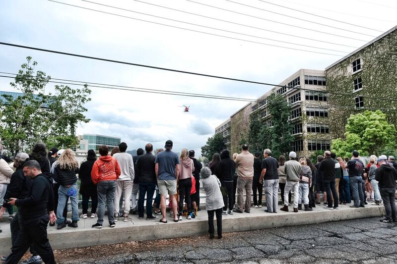 California storms People watch from a bridge as a Los Angeles Fire Department rescue crew try to rescue a dog from the LA river in the Studio City section of Los Angeles on Monday, March 28, 2022. Two people and a dog were rescued from a rain-swollen Southern California river Monday as a vigorous late-season storm moved slowly through the state, bringing heavy showers and snow. A helicopter rescue crew pulled the dog's owner, a woman, from the rushing Los Angeles River, in the San Fernando Valley, around 2:40 p.m. But the dog slipped away and continued for more than an hour down the river, which runs through an inaccessible channel with high concrete walls for several miles. (AP Photo/Richard Vogel) (Richard Vogel/AP)
