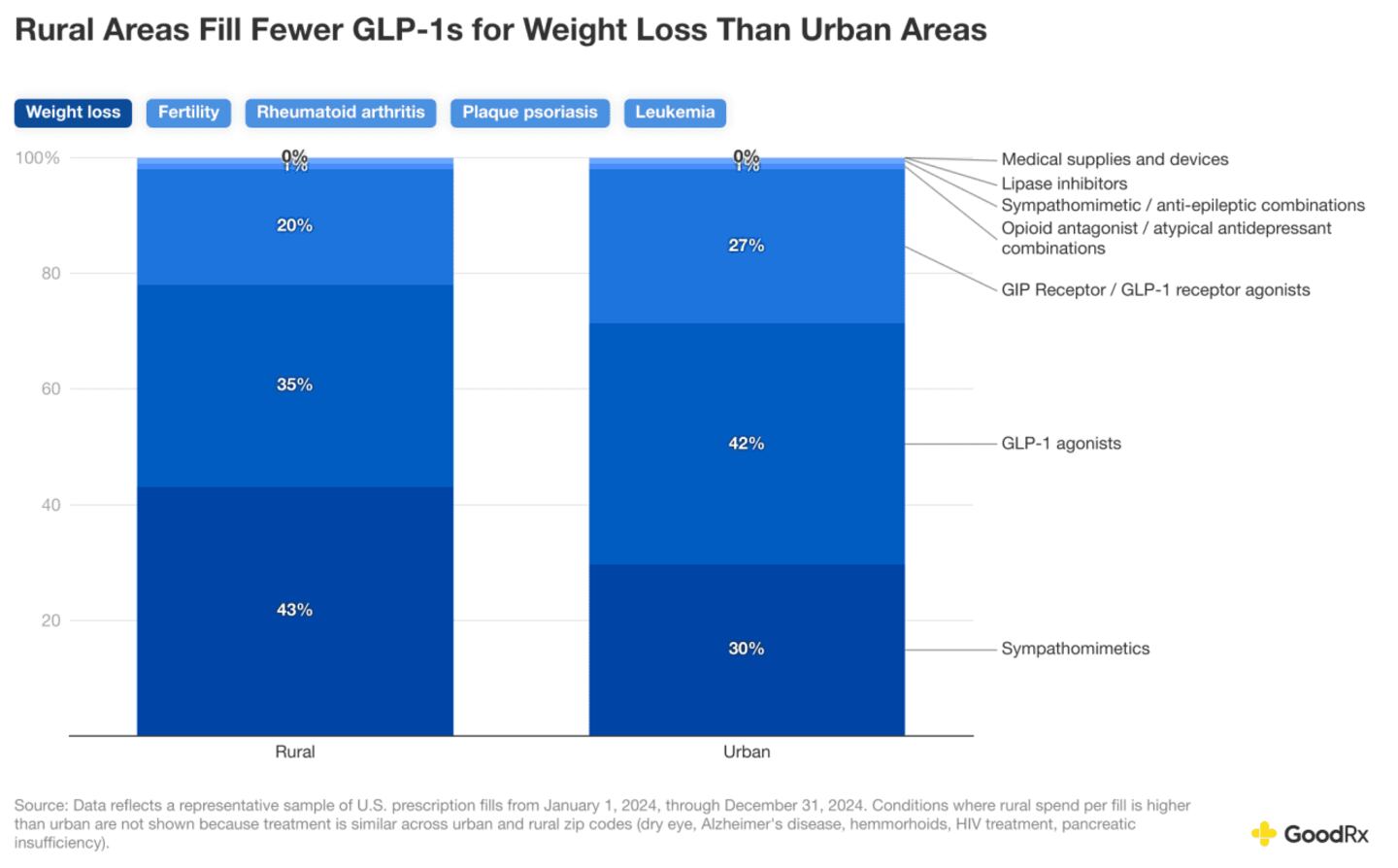 When it comes to weight loss, GLP-1s are a newer class of medications that include Wegovy and Zepbound. These are filled less frequently in rural zip codes. In contrast, older and/or generic medications, such as phentermine, make up a larger share of weight-loss prescriptions in rural areas. This disparity may reflect differences in healthcare provider access, insurance coverage, cost sensitivity, or clinical adoption of newer therapies.