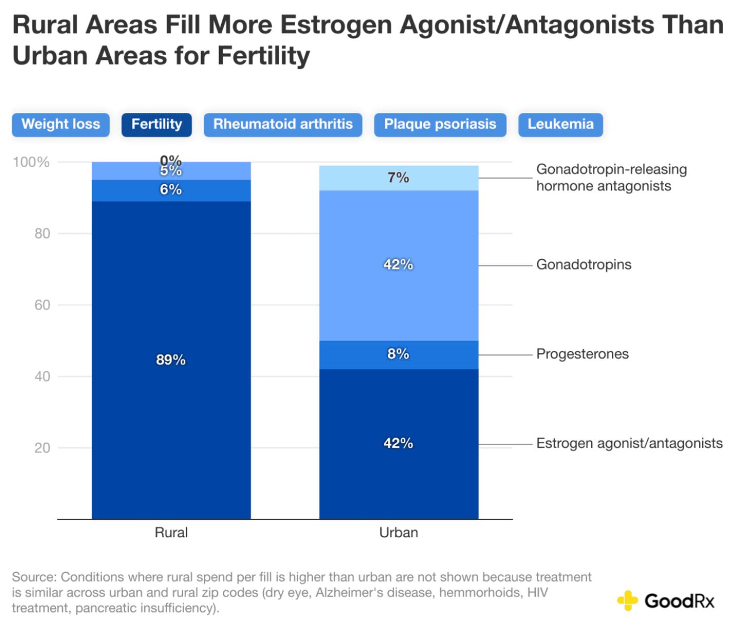 Residents in urban versus rural areas don't always face wide-scale gaps in out-of-pocket prescription expenditures. But the gap is notable for some treatments, such as fertility medication. People living in rural areas spend 83% less on fertility medication than people living in urban areas. One likely reason for this is utilization and access. A study published in 2016 examining fertility outcomes in women of reproductive age in Georgia found that compared to women living in urban areas, women in rural areas were 11% less likely to see a doctor for fertility treatment.