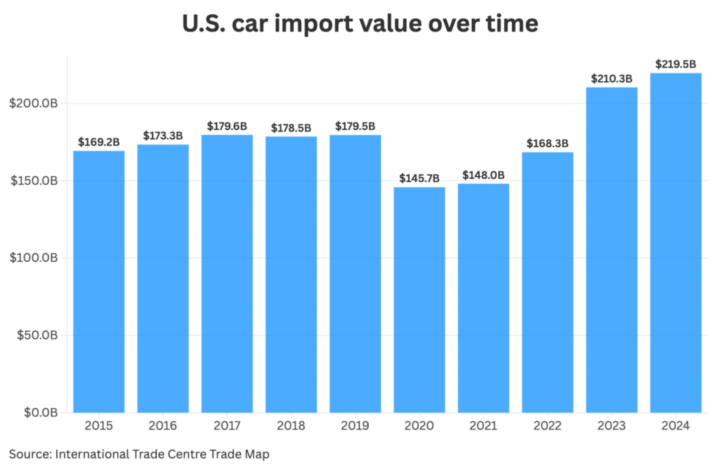 In 2024, the U.S. imported almost $220 billion worth of cars from 84 countries and territories, a 50.6% jump from 2020's $145.7 billion.