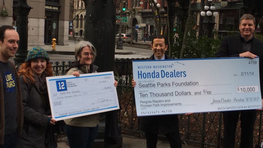 SEATTLE — On Tuesday two self-described moms helped present Seattle Parks Foundation with $26,000 to repair the historic Pergola in Pioneer Square. Rowdy fans climbed on top and damaged it after the Seahawks won the Super Bowl. But the price tag to fix the pergola is dropping from the initial $25,000 estimate.
