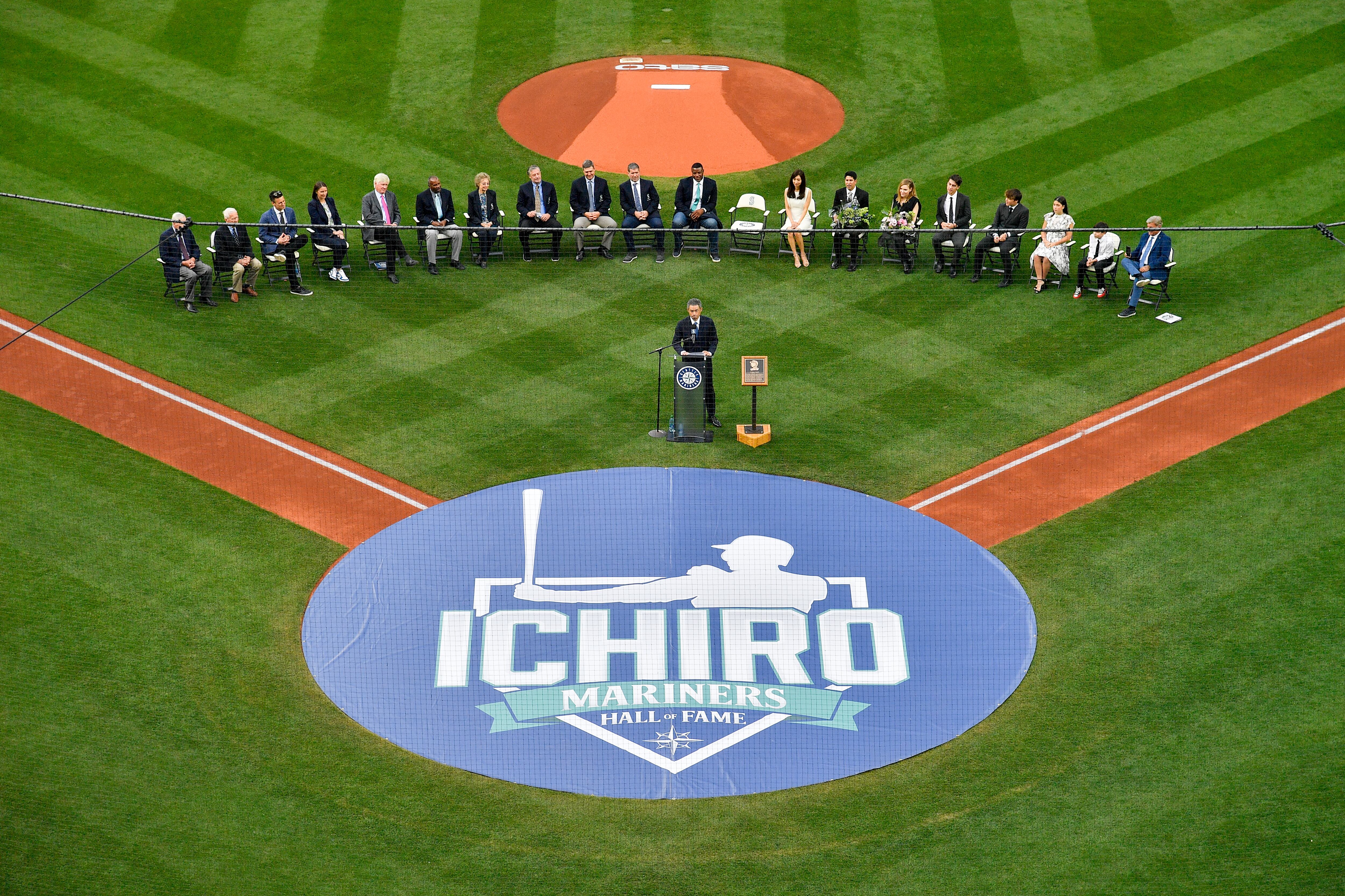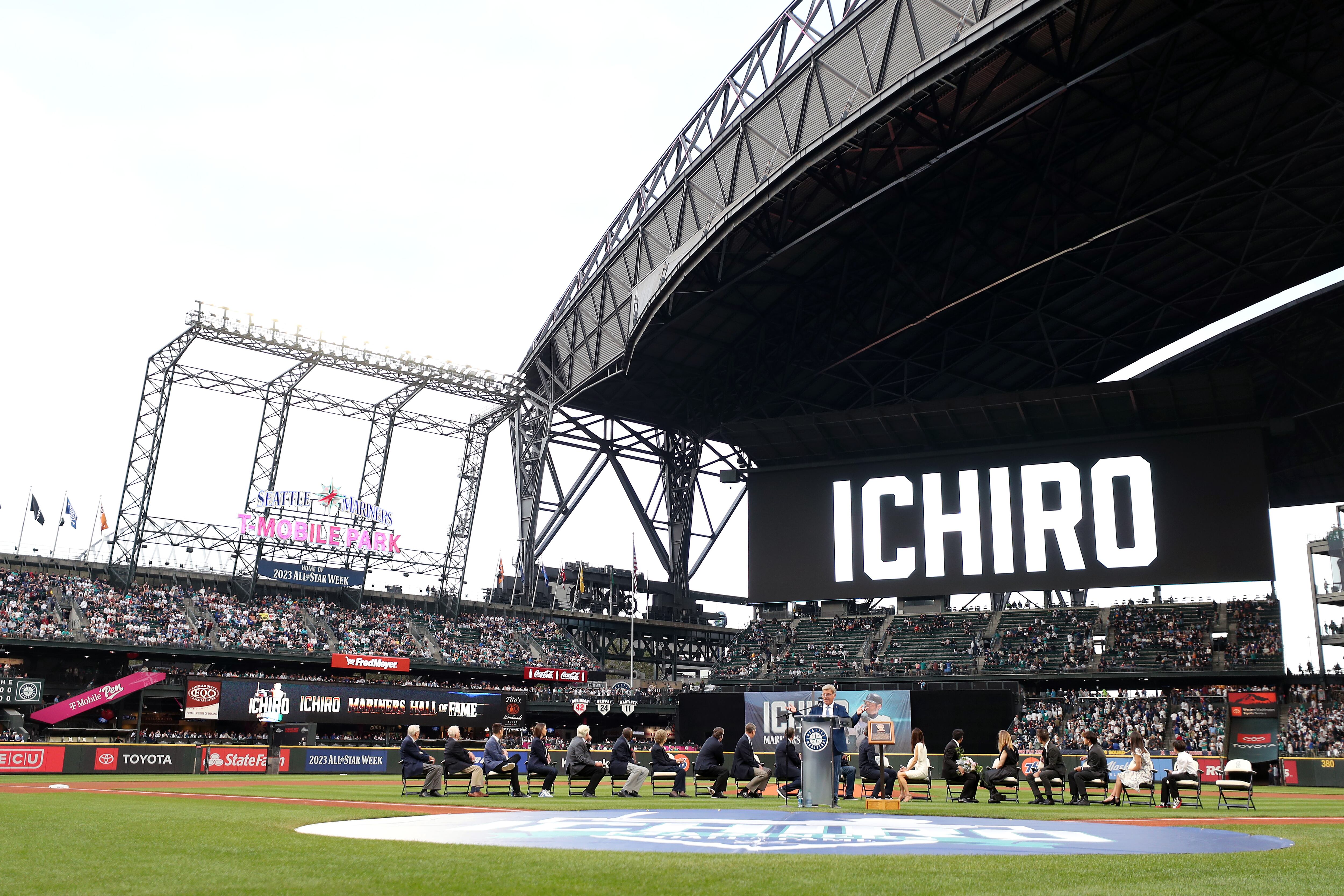 Suzuki became the 10th member of Seattle’s Hall of Fame, joining former teammates Ken Griffey Jr., Edgar Martinez, Jamie Moyer, Jay Buhner and Dan Wilson who had previously been honored by the club. All but Buhner were in attendance.