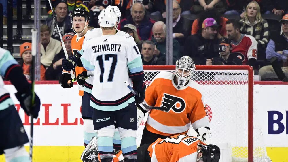 It appeared Schwartz’s second goal would be plenty of breathing room for Seattle, especially after Travis Konecny was sent to the box for a delay-of-game penalty late in the third. But Brown converted a short-handed tally with an unlikely goal on a slap shot from the side boards.