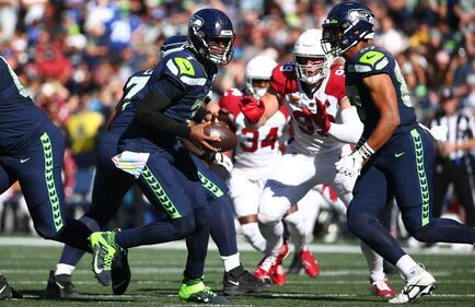 Arizona Cardinals v Seattle Seahawks SEATTLE, WASHINGTON - OCTOBER 16: Geno Smith #7 of the Seattle Seahawks looks to hand off against the Arizona Cardinals during the first half at Lumen Field on October 16, 2022 in Seattle, Washington. (Photo by Lindsey Wasson/Getty Images) (Neil Enns/Getty Images)