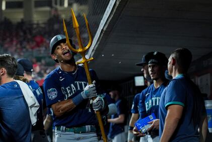 Julio Rodriguez Seattle Mariners' Julio Rodriguez celebrates in the dugout with the trident after hitting a solo home run during the seventh inning of a baseball game against the Cincinnati Reds in Cincinnati, Tuesday, Sept. 5, 2023. (AP Photo/Aaron Doster) (Aaron Doster/AP)
