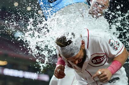 Nick Martini Cincinnati Reds' Nick Martini, front, is doused by teammate Nick Senzel after the final out of a baseball game against the Seattle Mariners in Cincinnati, Tuesday, Sept. 5, 2023. (AP Photo/Aaron Doster) (Aaron Doster/AP)