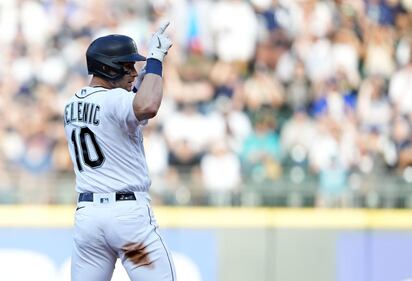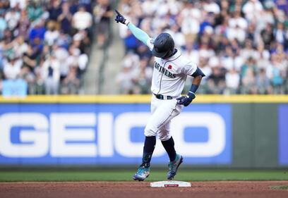 Seattle Mariners' Jarred Kelenic reacts after stealing second base against the New York Yankees during the second inning of a baseball game Monday, May 29, 2023, in Seattle. (AP Photo/Lindsey Wasson) (Lindsey W/Lindsey Wasson, Associated Press)
