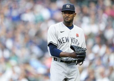 New York Yankees starting pitcher Domingo German walks off the field after throwing against the Seattle Mariners during the second inning of a baseball game Monday, May 29, 2023, in Seattle. (AP Photo/Lindsey Wasson) (Lindsey W/Lindsey Wasson, Associated Press)