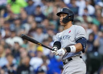 New York Yankees' Aaron Judge watches his two-run home run against the Seattle Mariners during the third inning of a baseball game Monday, May 29, 2023, in Seattle. (AP Photo/Lindsey Wasson) (Lindsey W/Lindsey Wasson, Associated Press)