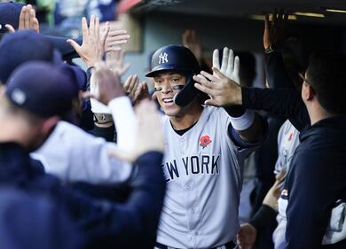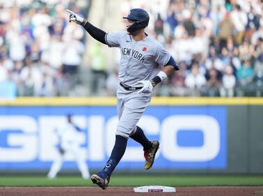 New York Yankees' Aaron Judge celebrates after his two-run home run against the Seattle Mariners with Gleyber Torres during the third inning of a baseball game Monday, May 29, 2023, in Seattle. (AP Photo/Lindsey Wasson) (Lindsey W/Lindsey Wasson, Associated Press)