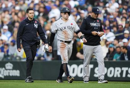 New York Yankees' Harrison Bader, center, leaves a baseball game with an apparent injury while accompanied by a trainer, left, and manager Aaron Boone, right, during the third inning of a baseball game against the Seattle Mariners in Seattle. (Lindsey W/Lindsey Wasson, Associated Press)